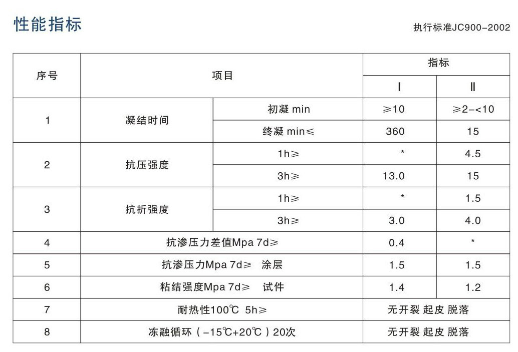 本产品是以特种水泥和添加剂,经特殊工艺加工而成的具有堵漏功效的粉状防水材料,Ⅰ型(缓凝型)主要用于潮湿和微渗基层上作防水抗渗,I型(速凝型)主要用于渗漏或涌水基体上作防水堵漏,可带水作业。